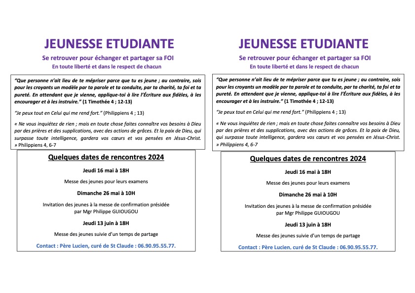Se retrouver pour échanger et partager sa FOI En toute liberté et dans le respect de chacun. 3 dates : - Jeudi 16 mai à 18H : messe des jeunes pour [...]